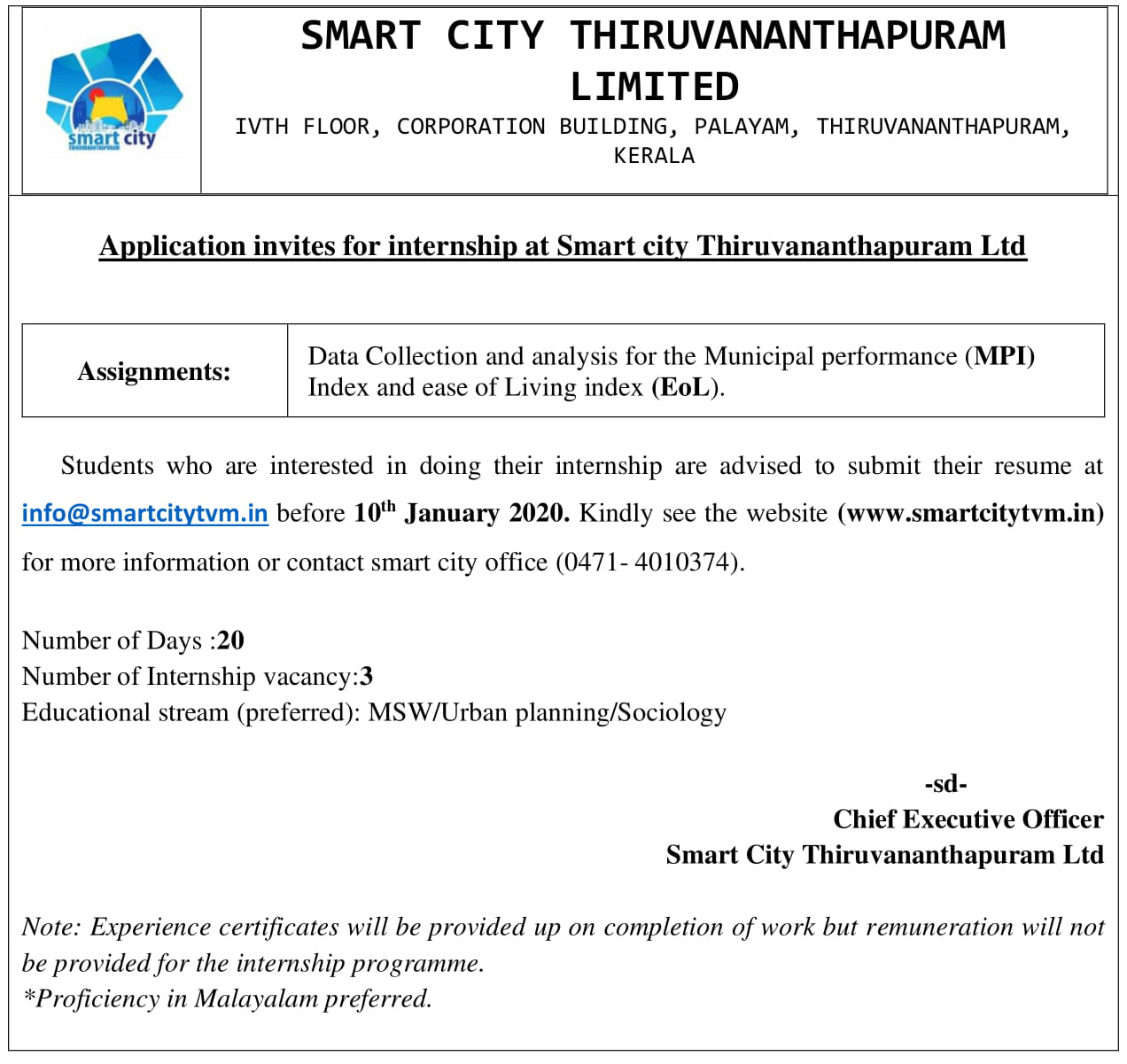 Oppotunity for hands -on job training for fresh graduates in the Field of Urban Planning,Civil Engineering, Electronice etc in Thiruvananthapuram