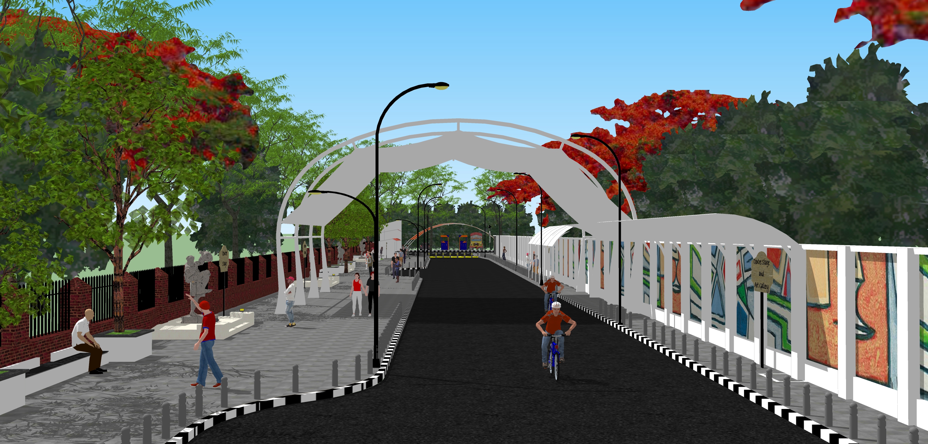 Manaveeyam Veedhi is a 180 m road stretch from MuseumVellayambalam Road to the Althara junction. This street is famous for the numerous artworks on display along the road and numerous cultural performances it hosts. SCTL's proposal is to facilitate the current activities in the Veedhi by giving the street a physical makeover and convert Manaveeyam Veedhi as a Cultural Street in all sense. The new streetscape design is pedestrian dominant and universally accessible, the design components are a covered venue, sculptures, art gallery space, Exercise park, street library, gender friendly toilets, drinking water fountains, food kiosks and cycle parking area.